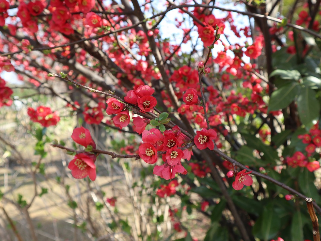 真っ赤に咲き乱れる庭園入口近くのボケの花。