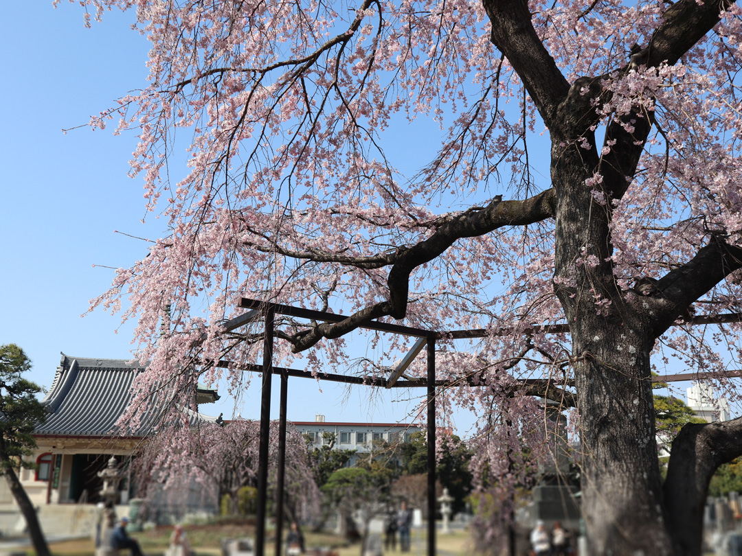 ソメイヨシノよりひと足早く咲く原木山妙行寺のしだれ桜は、お彼岸の今ちょうど満開です。