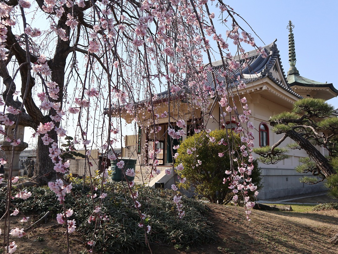 大荒行堂の前に植樹された紅枝垂桜は3〜4部咲き。