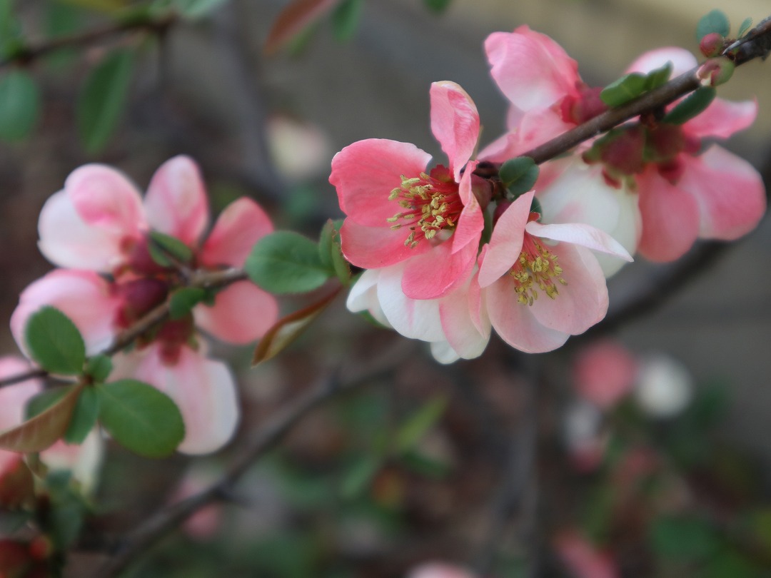 ボケの品種によっては白から赤へと花色を変えるものもあり、植物の神秘に感動することしきりです。