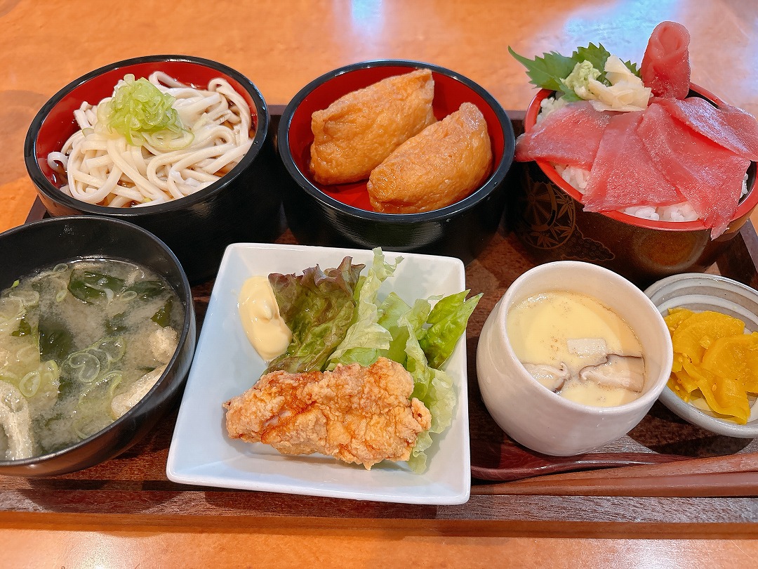 マグロ丼・稲荷寿司・稲庭うどんの炭水化物トリオ。