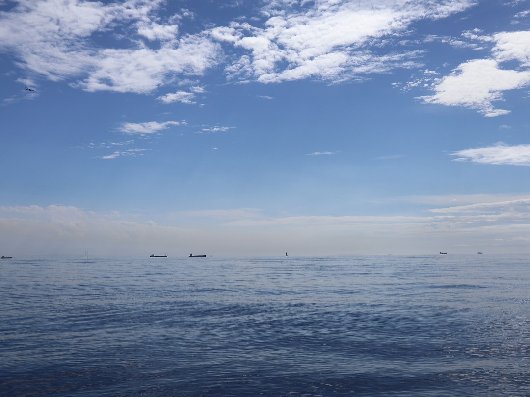 目の前に広がる青空と白い雲、東京湾の大海原と水平線上に浮かぶ船。