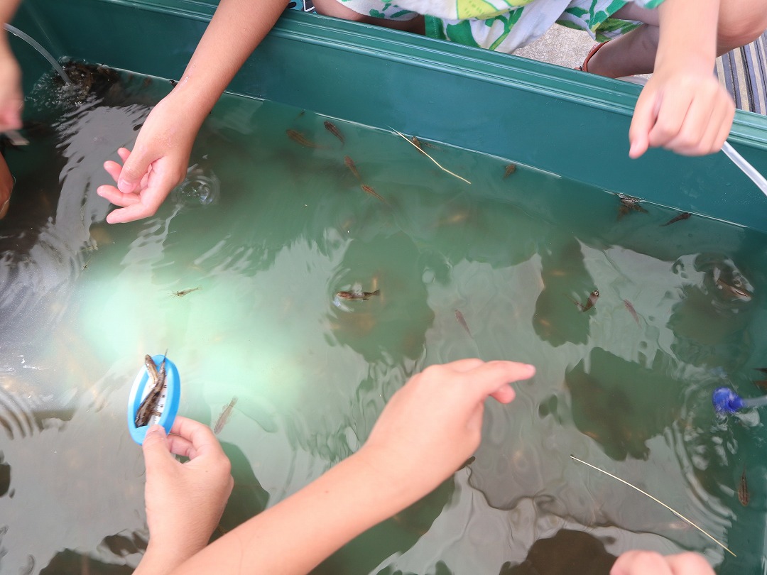 朝水揚げしたばかりのボサ(木の枝や竹を束ねて作る仕掛け)に着いていた生き物に触れるとあって、お子さんたちが目を輝かせて水槽の周りを囲んでいました。