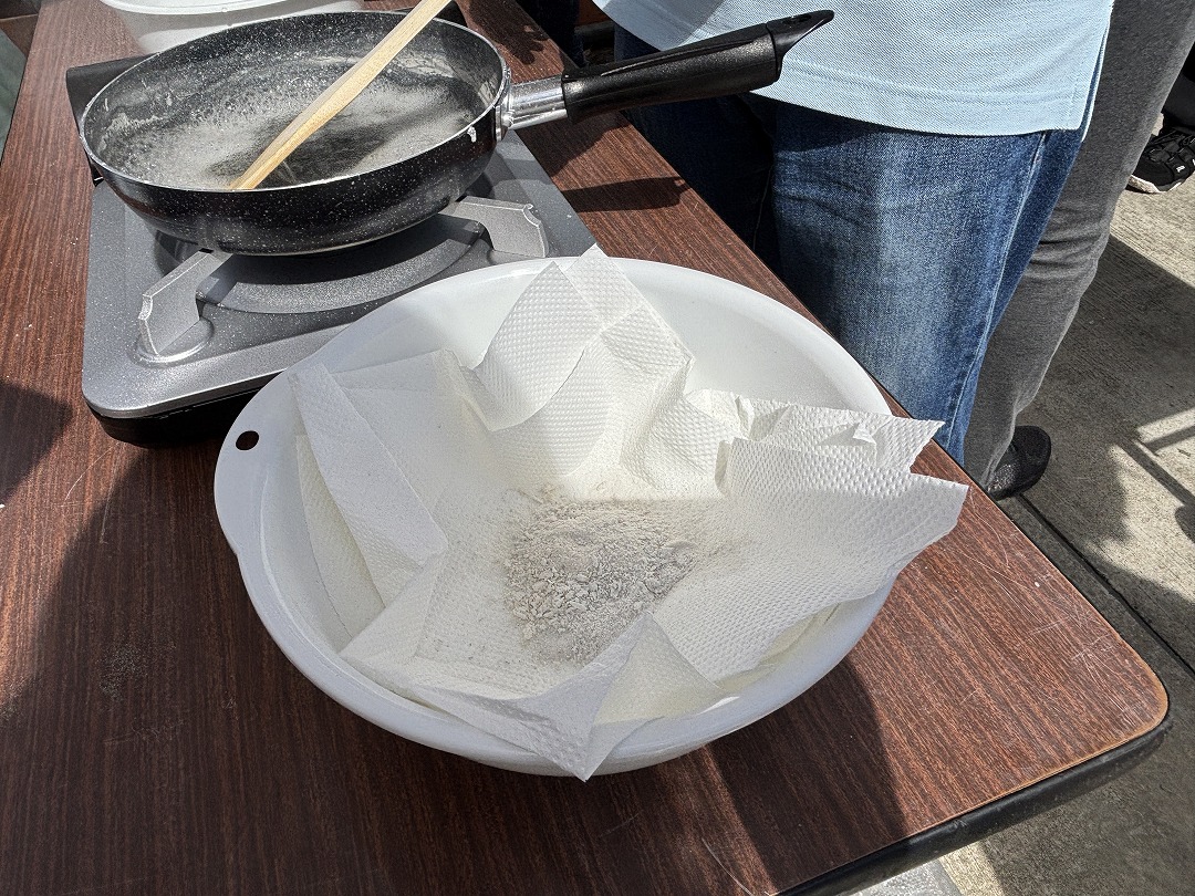 ③濾して濃縮された塩水をフライパンで加熱し、泡立ったら火をつけたまま5分間ほどシャモジでかき混ぜます。