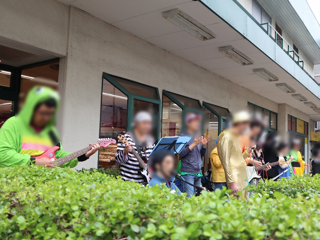 雨予報により沿道でのエンタメが中止の憂き目に遭う中、唯一参加したレンコンバンド。