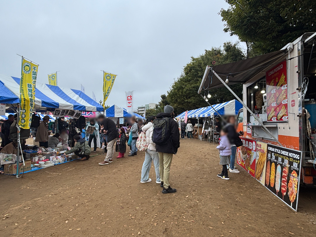 祭り日和から程遠い天候の中、行徳駅前公園の広場にはテントが並び、屋台営業が始まりました。