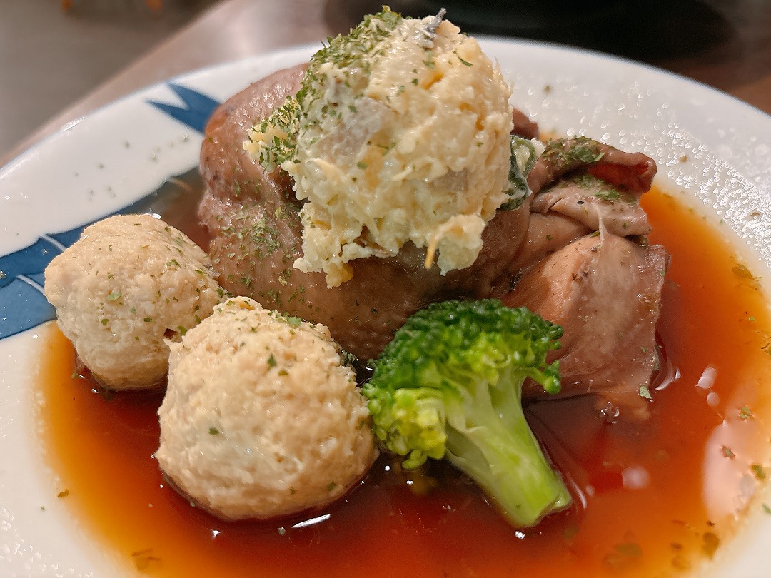 さらには鶏団子2個とマッシュポテトにブロッコリーまで。