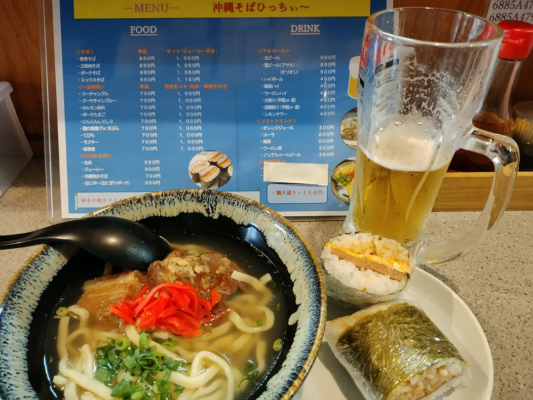 バルメニューはドリンク1杯+沖縄そばハーフ+ポークおにぎりでした。