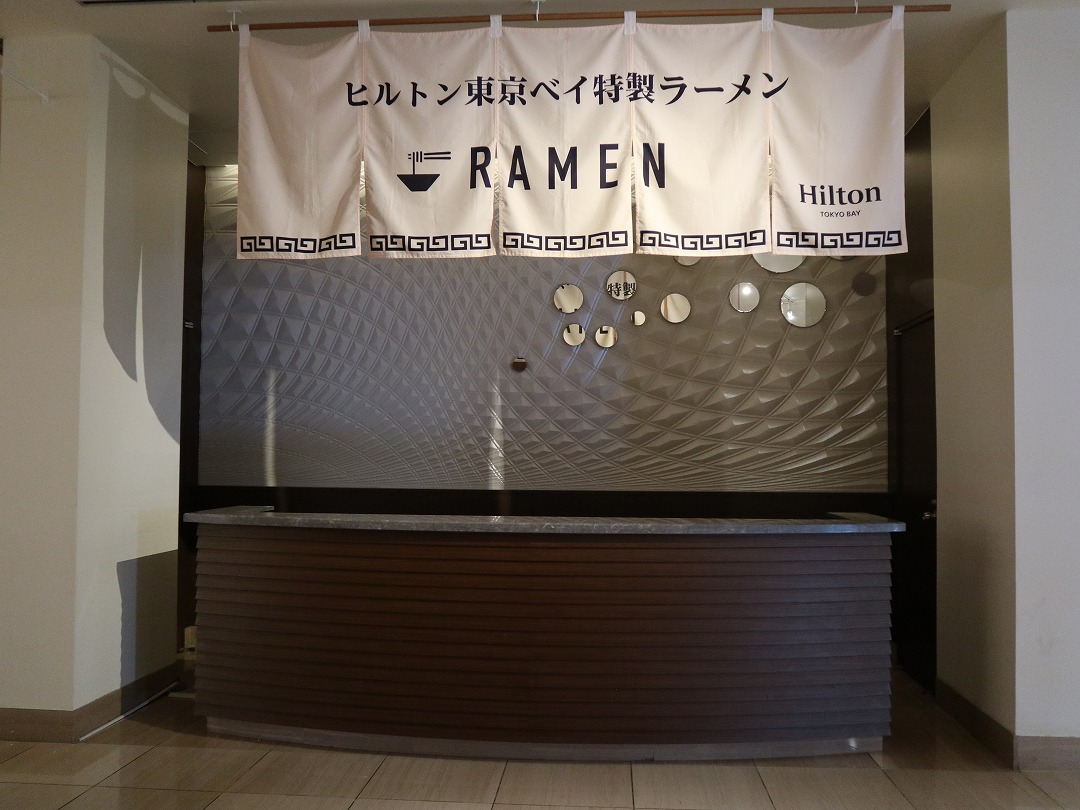 ラウンジ付近の一画でさりげない存在感を示す「ヒルトン東京ベイ特製ラーメン」なる暖簾。