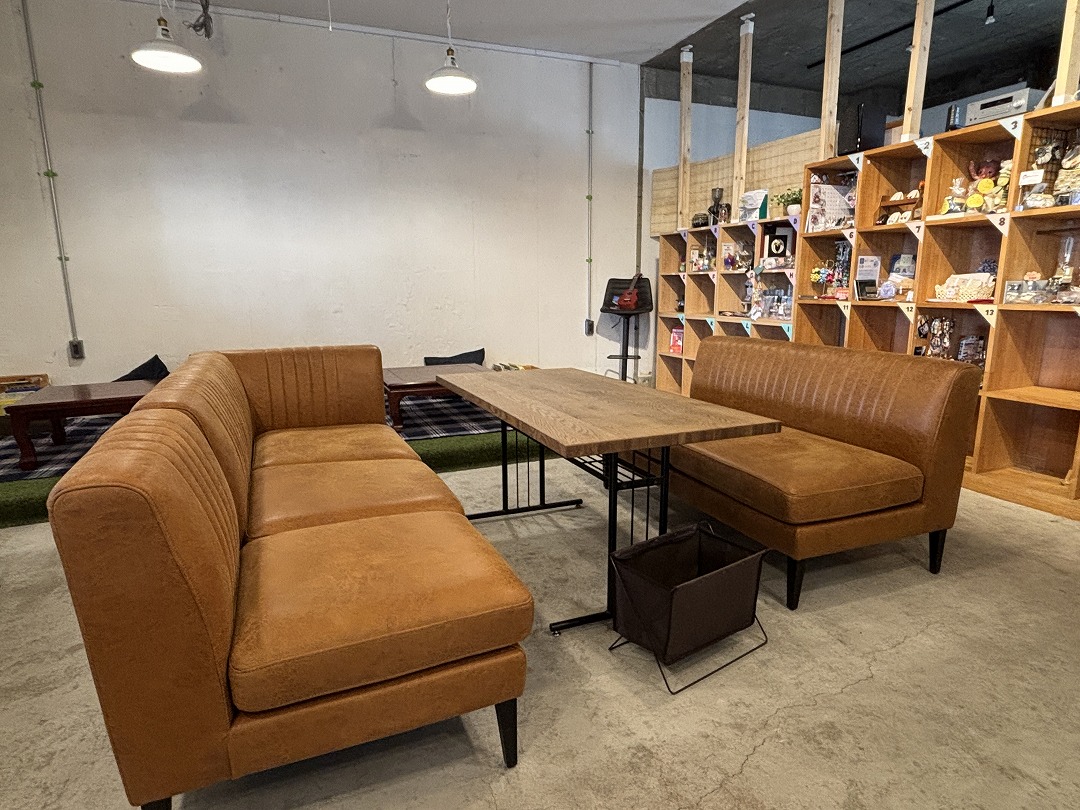 ゆったりとくつろげるソファや小上がり席も用意され、自宅みたいにゆったりくつろげそうな雰囲気の店内。