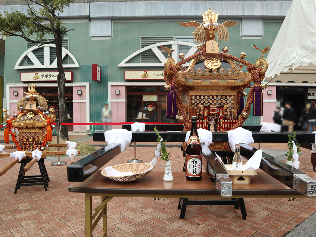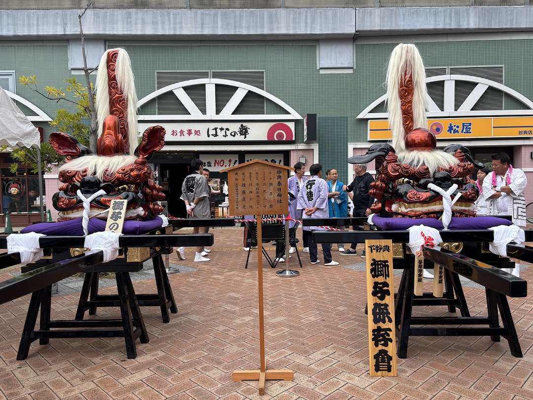 妙典駅ロータリーでは、今回の実演で使用される神輿や獅子頭が展示されていました。