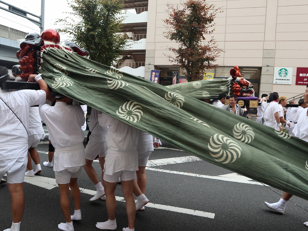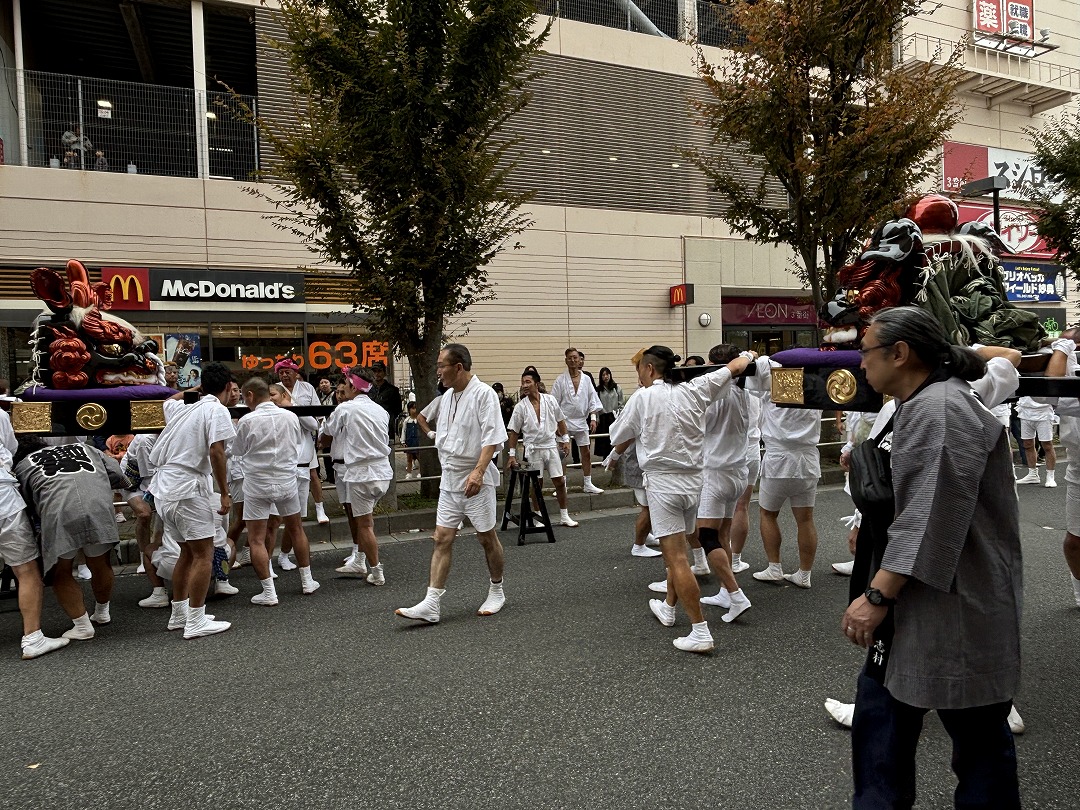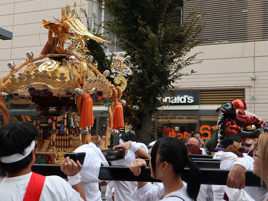 子供神輿と山車の巡行終了後、獅子頭と中神輿の場外巡行が始まりました。
