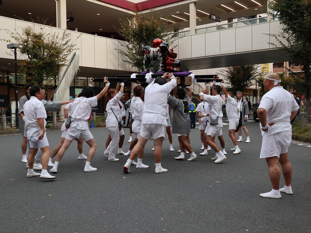 中神輿が駅前に戻った後も続く雌の獅子頭渡御。