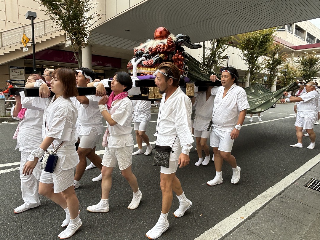 雌の獅子頭に女性の担ぎ手が加わりました。